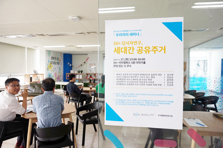 지난달 27일 서울시50플러스 서부캠퍼스 3층 더하기홀에서는 주거행복창작연구회의 ‘50+당사자연구, 세대간 공유주거’ 세미나가 열렸습니다. 이번 세미나는 서울시50플러스재단이 주관하는 ‘2017년 50+당사자연구’ 공모에 당선된 주거행복창작연구회 연구 활동(세대간 협력형 공유주거 활성화 방안 연구: 서울시 '한지붕 세대공감' 사업을 중심으로)의 첫 신호탄입니다.