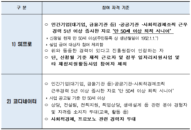 * (SE프로) 대기업·금융기관 등 민간기업, 사회적경제조직 등에서 근무경력 5년 이상의 ‘50세 이상 퇴직전문인력’
