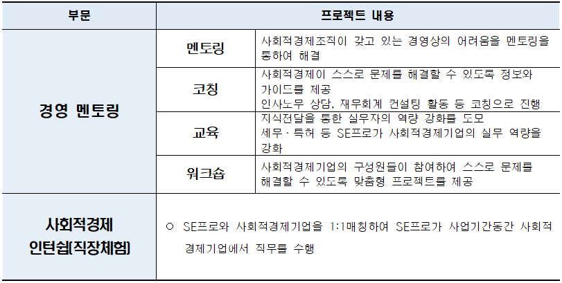 - (경영 멘토링) SE프로가 단기·장기자문, 코칭, 교육, 워크숍 방식 등을 통하여 사회적경제기업의 경영상의 어려움을 해소
