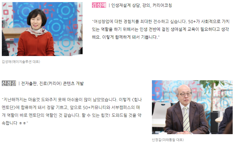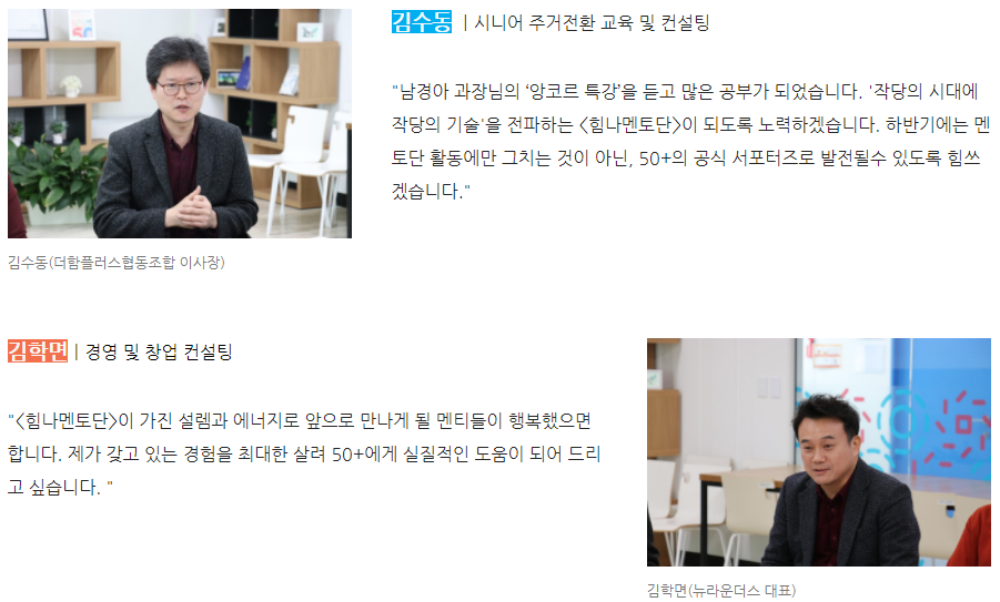 앞으로 50+커뮤니티지원단과의 유기적인 협력을 통해, 50+커뮤니티의 입문과 성장 그리고 단체설립 컨설팅까지 단계별 멘토링 프로그램을 운영할 예정이다.