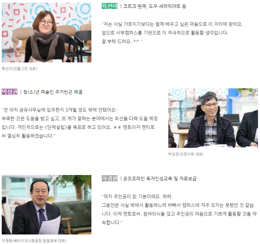 이렇듯 창업, 교육, 문화예술, 사회공헌 등 각자의 분야에서 이미 풍부한 경험과 노하우를 가진 전문가 멘토 7인방!