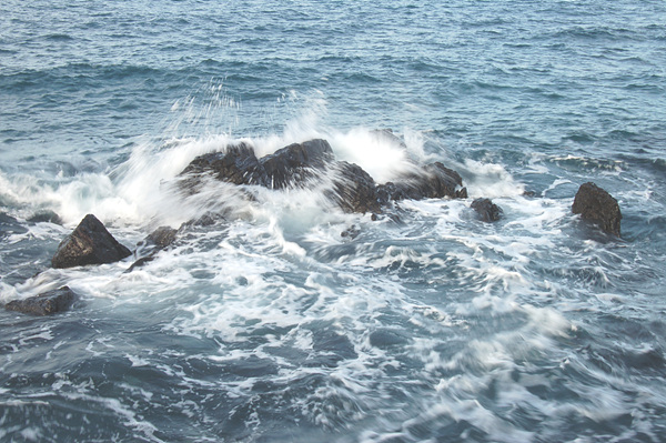 바닷가 바위에 파도가 부딪혀 부서지고 있다