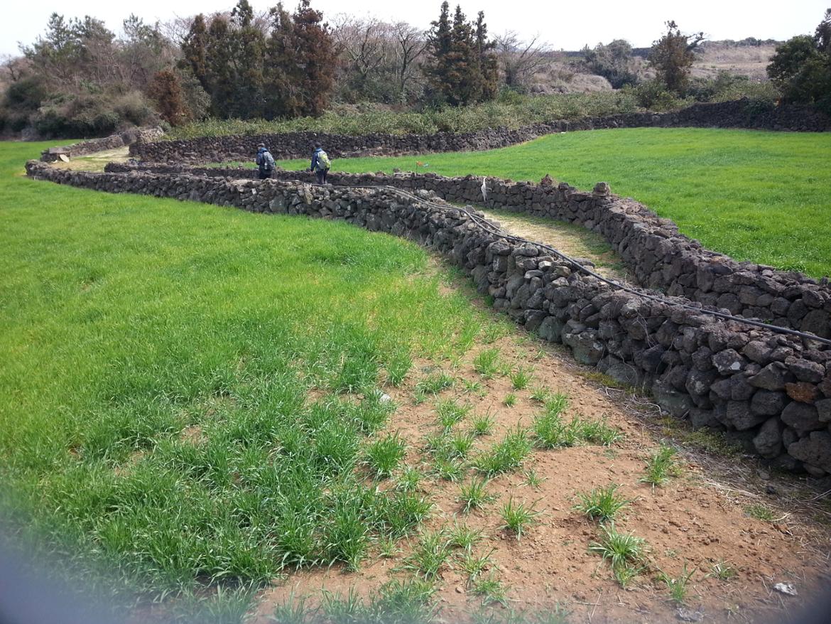보리밭길의 돌담 사이에 난 길로 올레꾼들이 걷고 있다