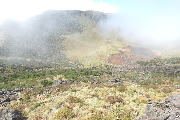 한라산 정상 백록담. 구름이 산정을 가려 신비로운 모습이 연출되고 있다