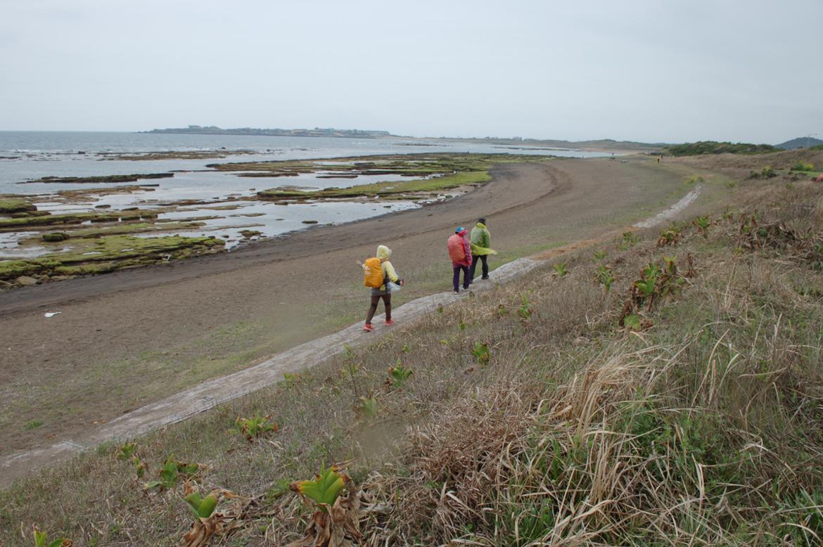 부슬비가 내리는데도 성산일출봉 부근 광치기해변을 걷고 있는 올레꾼들