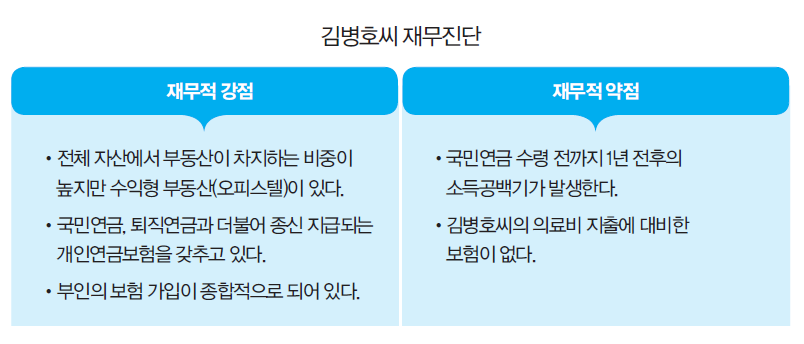 암보험은 보장기간이 80세인 점이 좀 아쉽다. 부인이 가입하고 있는 실손보험의 특약에는 암이나 뇌졸중, 그리고 심근경 색과 같은 주요 질병에 대한 진단비가 포함되어 있지만 김병호씨의 경우는 퇴직으로 인해 질병이나 상해에 대한 보장을 받을 수 없기 때문에 늦기 전에 월 보험료 10 만원 수준에 100세까지 보장받을 수 있는 실손담보를 포함한 건강보험에 가입할 것을 권한다.