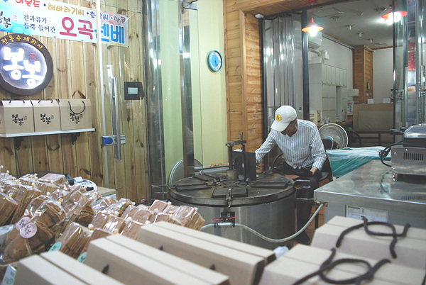 남부시장의 한 가게에서 상인이 과자를 굽고 있다.