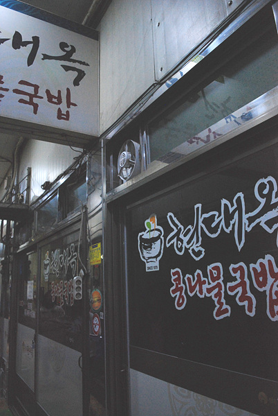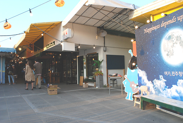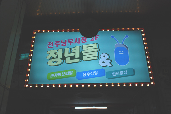 전주 남부시장의 사용하지 않는 공간이었던 2층의 청년몰.                                                          청년몰로 올라가는 계단 입구의 간판