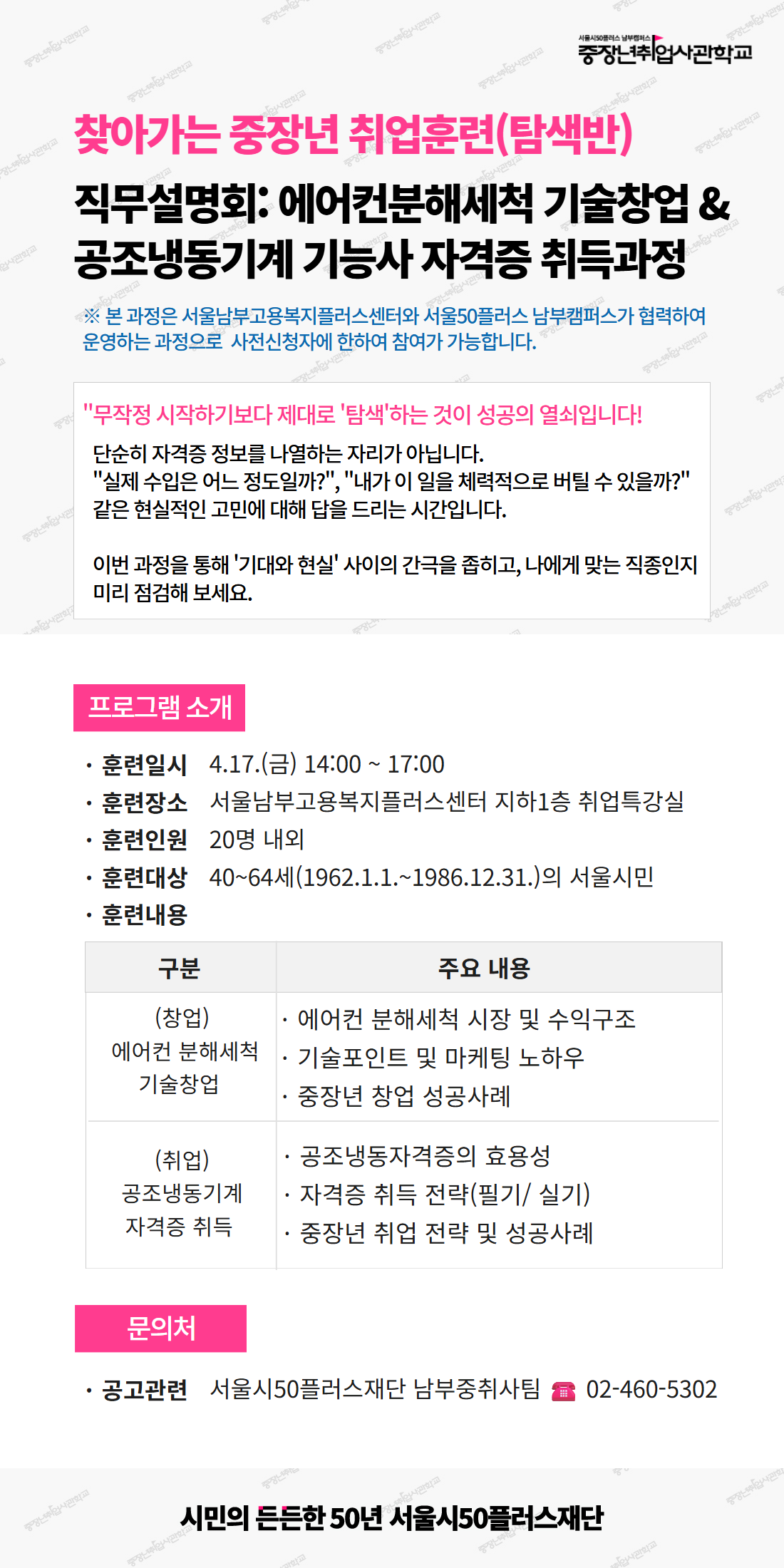 탐색반「직무설명회: 에어컨 분해세척 창업·공조냉동기계 자격증 취득과정」 참여자 모집마감 D-DAY