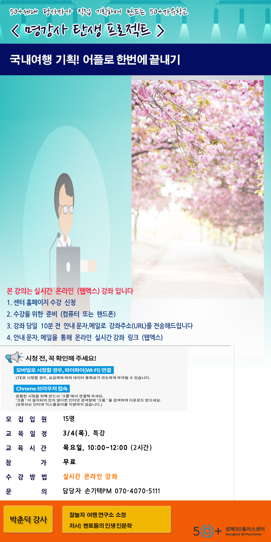 (1 회차) 2021.03.04(10:00 ~ 12:00) 박춘덕 어플로 국내여행 기획하기! 실시간 웹엑스 온라인 강좌